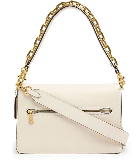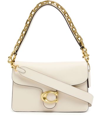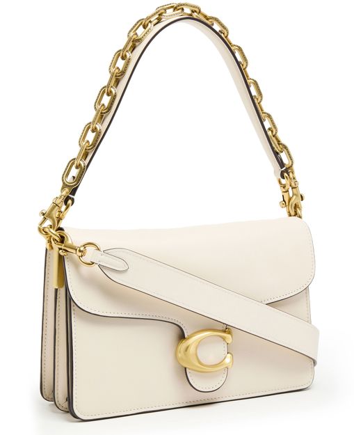 Reveal Coach's Tabby shoulder bag, featuring a magnetic flap closure and an elegant gold finish. With double handles, a front logo, a back pocket, and visible topstitching, this bag offers versatile style with a detachable wide chain strap.