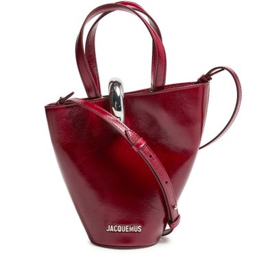 Unveil Jacquemus's small Bambola, an asymmetric bag in glossy vintage-finished leather combining elegance and functionality. Featuring a sleek metallic logo, this bucket style enhances any look. With its dual handles and a detachable strap, it offers diverse carrying options while ensuring comfort and style for modern trendsetters.