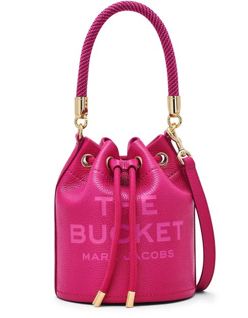 The Marc Jacobs The Bucket bag is a stylish accessory crafted from textured leather. It features a slender, detachable shoulder strap and a convenient handle for versatile carrying options. The bag showcases a front logo and elegant gold metal finishes. With a drawstring closure, it can be hand carried, worn on the shoulder, or crossbody.