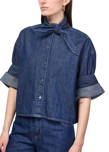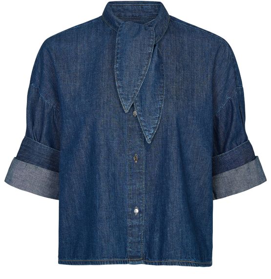 Reveal Twp's high-neck short-sleeved top, where a refined silhouette meets modern flair. The dropped, cuffed sleeves and front buttoned closure create a sleek profile, while visible stitching adds a contemporary edge. Perfect for elevating both casual and sophisticated ensembles with effortless style.