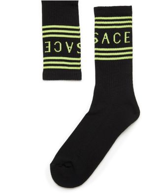 Versace's 90s Vintage Logo Socks offer an ankle-length cut with a stylish ribbed finish. The jacquard logo proudly displays the brand's iconic heritage, making these socks a statement piece for any outfit. Perfect for those who appreciate a blend of comfort and high fashion, they elevate everyday wear effortlessly.