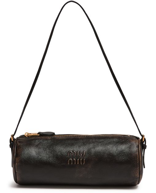 Reveal Miu Miu's aged leather shoulder bag, crafted from distressed leather with a single handle and gold finish. Metallic 'Miu Miu' lettering and visible topstitching highlight the brand’s signature style, while a zipper closure and leather lining ensure both security and refined functionality.