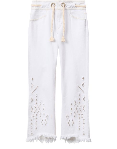 Reveal Isabel Marant's drawstring hem jean, featuring a calf-length silhouette with fringe accents and visible stitching. The adjustable drawstring waist ensures a personalized fit, while two front pockets add practical flair. This piece effortlessly blends comfort and modern edge for versatile, everyday styling.