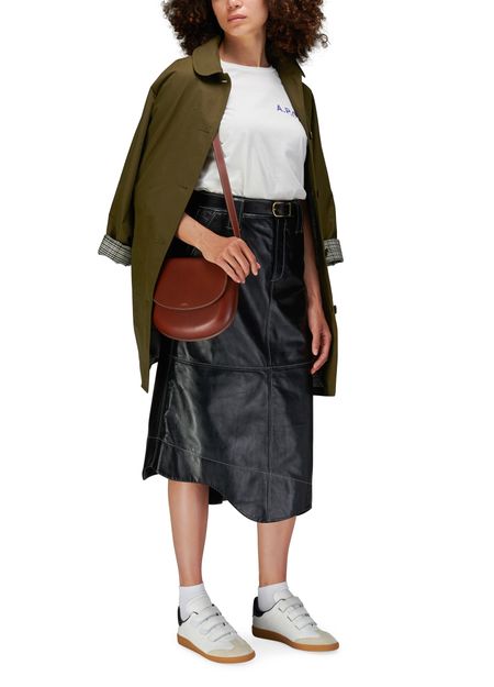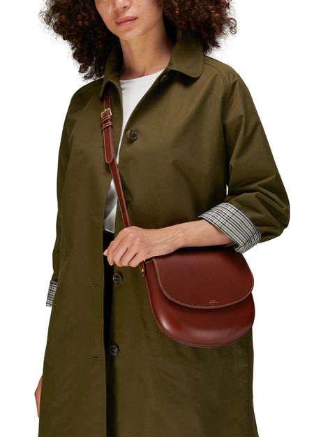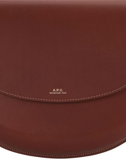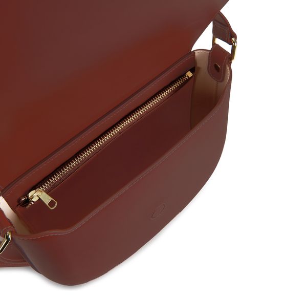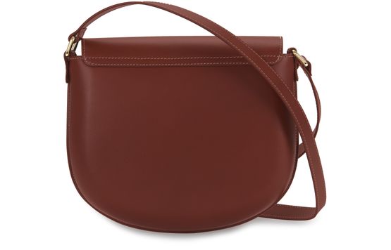 Description : narrow adjustable strap, contrast stitching, logo printed on the front, smooth leather, gold-tone metal details, flap closure, worn on the shoulder.