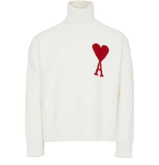 Ami de Cœur turtleneck sweater is a trendy knit sweater with a loose fit. It features a ribbed texture and a cozy rollneck/turtleneck design. With long sleeves and a chest logo, this sweater is both stylish and comfortable for the colder seasons.