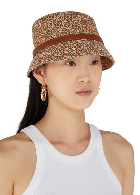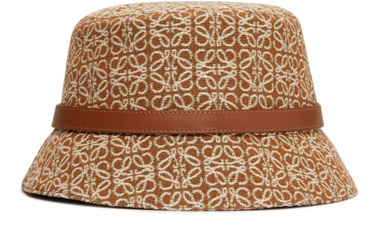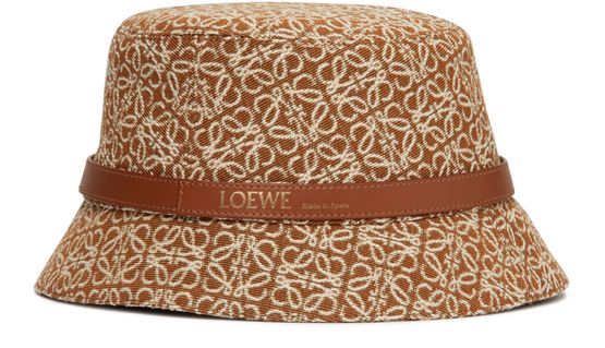 The elegance of the Anagram bucket hat is sure to impress! Its jacquard pattern and fine leather ribbon, embellished with the Loewe logo in gold letters, make it a must-have way to complete a chic outfit.
