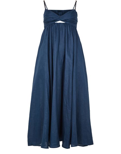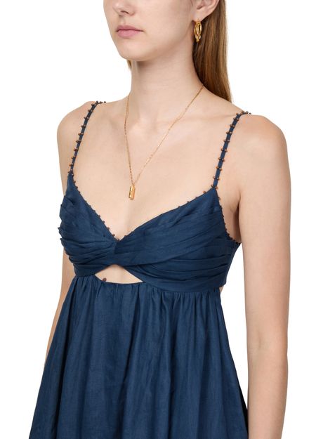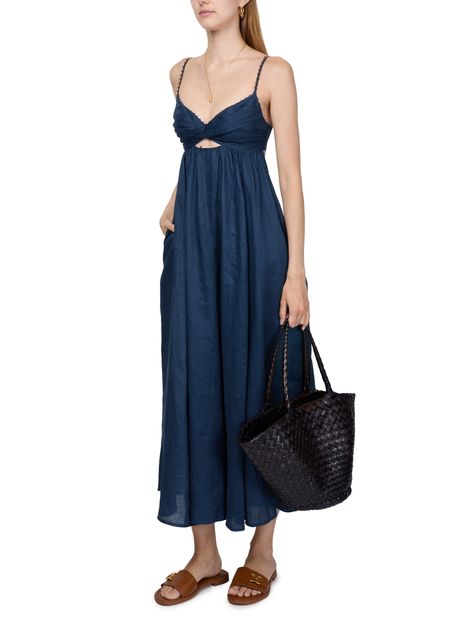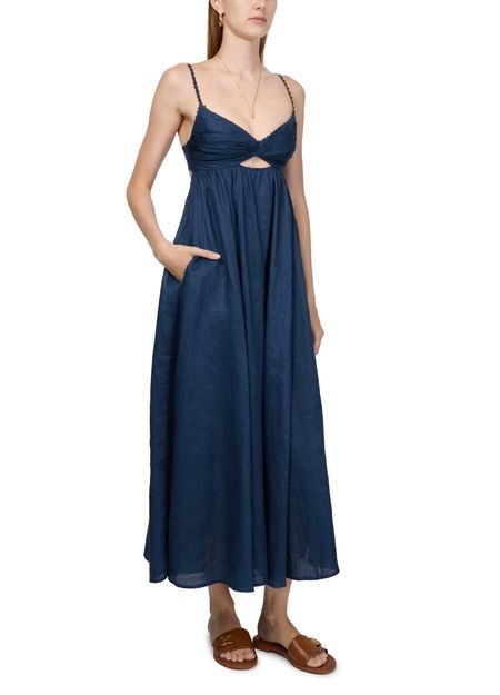 Unveil Zimmermann's Ascension twist front dress, a stunning flared piece with a loose fit that promises effortless elegance. This midi dress features a captivating V-neck and sleeveless design, enhanced by backless details and twisted accents. With a back zipper closure and hook fastening, it's a must-have for any stylish wardrobe.
