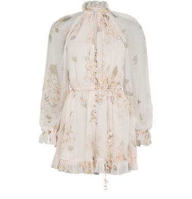 Discover the Zimmermann Balance Flutter Playsuit, where floral prints meet a high-neck design. This short, loose-fit jumpsuit boasts ruffled sleeves and pleated details, adding flair to its long-sleeved silhouette. Side pockets and a gathered waist complete this effortlessly stylish ensemble.