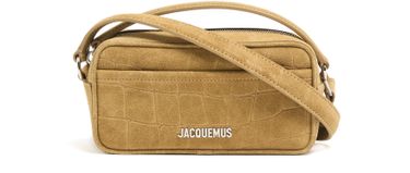 Jacquemus's Baneto bag showcases a sleek design with a zipper closure and a striking silver finish. Its double handles and adjustable wide strap allow for versatile styling, whether hand carried or worn crossbody. The front logo in silver letters adds a touch of elegance, complemented by interior patch pockets and visible topstitching.