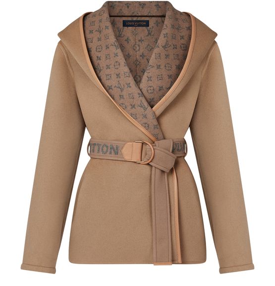 This chic short wrap pea coat is updated for the season in a fresh colorway and signed with the collection’s Louis Vuitton Paris belt for a contemporary touch. The double face wool-silk blend is soft, lightweight and warm, with a voluminous hood amping up the coziness. Complete with an iconic Monogram jacquard on the inside.