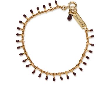 This bracelet from Isabel Marant displays a combination of audacious materials. The label brings a note of elegance and inserts fine coloured pearls all round the edge.