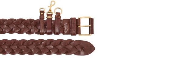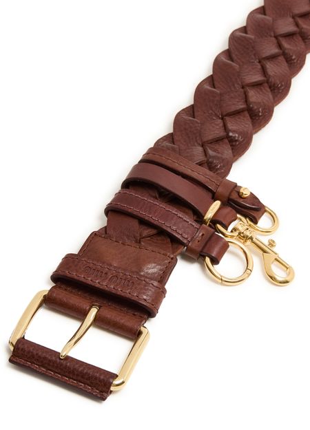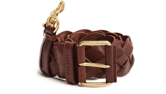 Reveal Miu Miu's braided leather belt, crafted from grained leather with an adjustable clasp and gold-tone hardware. This refined accessory seamlessly elevates any look, offering versatility for both casual and formal ensembles. Its distinctive design ensures a polished finish, making it an essential wardrobe staple.
