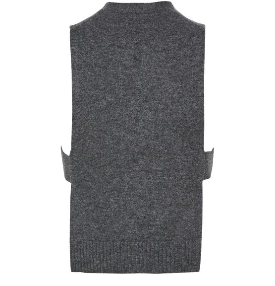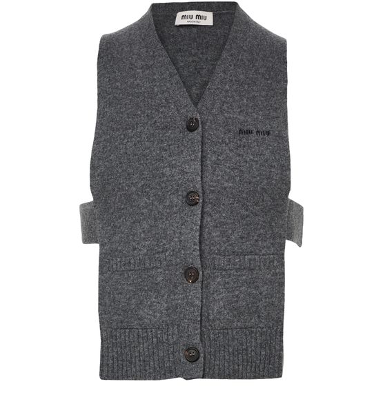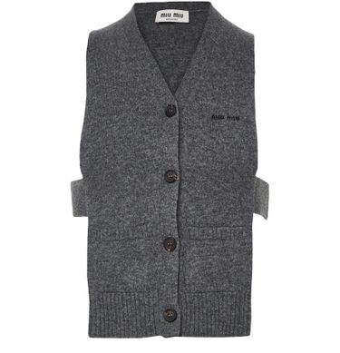 Reveal Miu Miu's cashmere bib cardigan, featuring a refined sleeveless silhouette and a front buttoned closure. The embroidered "Miu Miu" logo adds a signature touch, while the soft cashmere ensures a sophisticated feel. Perfect for layering, this piece transitions seamlessly from day to evening.
