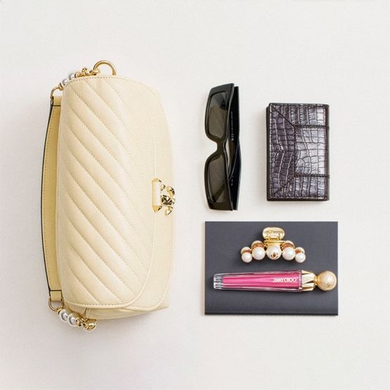 Reveal Jimmy Choo's Curve wallet with chain, a statement piece with a gold finish and a sleek chain strap. The front metallic logo and visible stitching highlight refined craftsmanship, while the flap and magnetic closure secure your essentials in a single compartment with a zippered interior pocket.