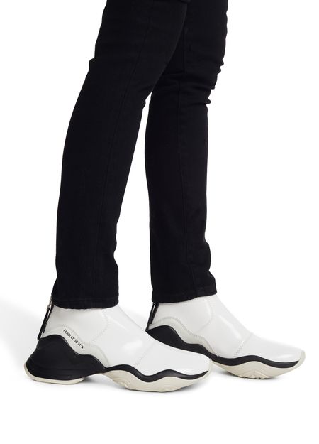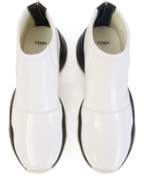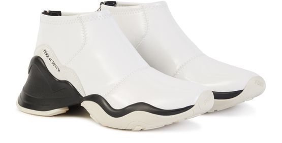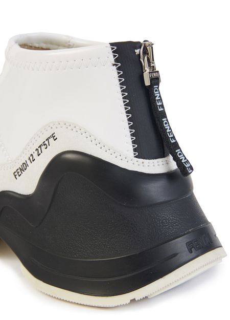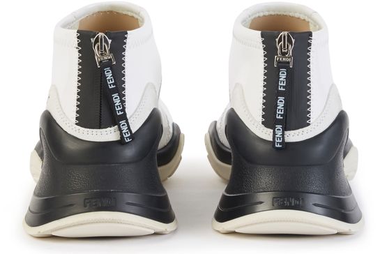 The snug fitting Ffluid trainers have a thick sole that makes them extra comfortable. This design by Fendi has a zip with zip tab behind the heel. The contrasting textures are enhanced by top stitching, creating an incomparable style for comfortable feet.