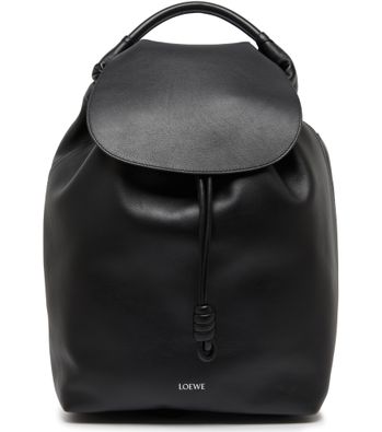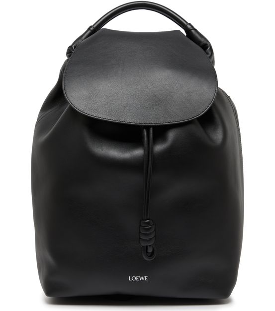 Loewe's Flamenco backpack in supple shiny calf leather combines elegance and functionality. Featuring a drawstring closure and a spacious single compartment, it offers interior patch pockets for organization. With double handles and an adjustable wide strap, this backpack is designed to be effortlessly carried on the back, showcasing visible topstitching for a refined touch.