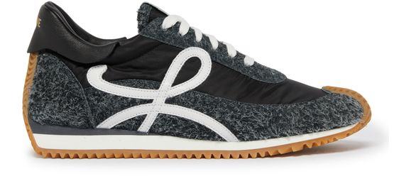 Loewe's Flow runner sneakers are closed sneakers with a round toe, featuring a logo on the side and embossed logo on the tongue. Made of nylon and suede, they offer a sleek and modern look for everyday wear. The logo-printed insole adds a touch of brand recognition to this stylish footwear.