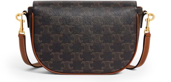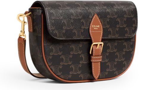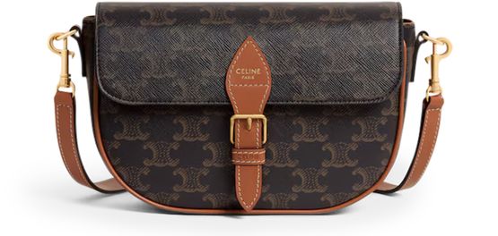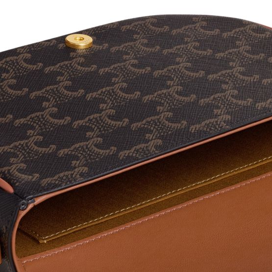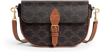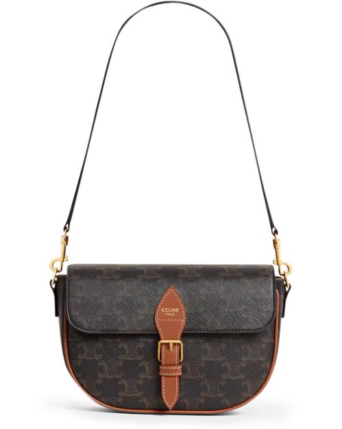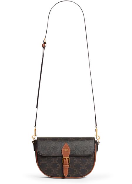 Discover Celine's Folco shoulder bag in Triomphe canvas and calfskin, a versatile piece with gold finishing. Designed for both shoulder and cross-body carry, it features a magnetic closure, decorative buckle, and two removable straps. A main compartment, inner flat pocket, and adjustable strap complete its functionality.
