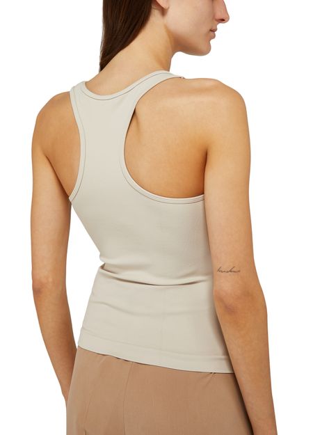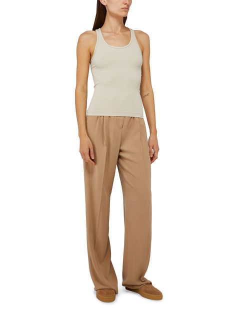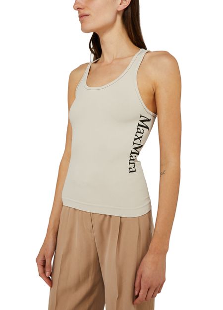 S Max Mara's Fortuna tank top is a sleeveless top with a round neck and a minimalist design. It features a subtle logo on the side for a touch of branding. This versatile piece can be easily styled for both casual and more dressed-up looks, making it a great addition to any wardrobe.