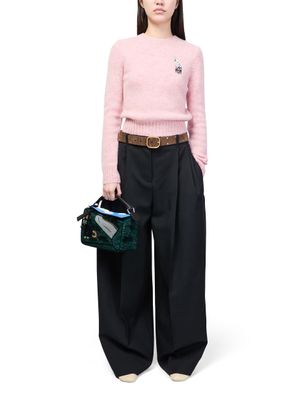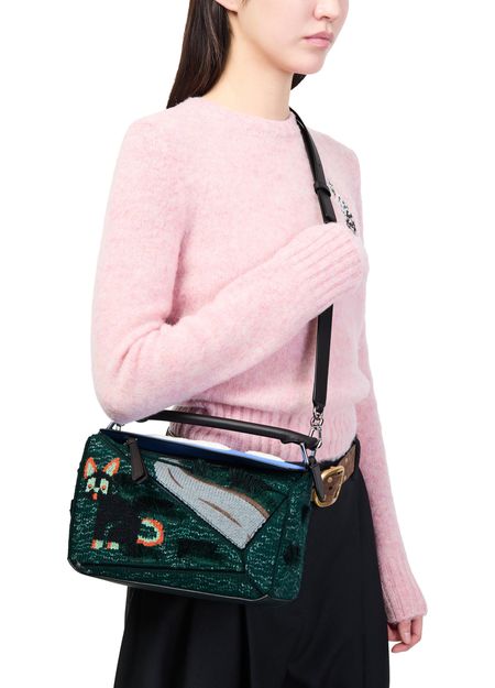 Reveal Loewe's Futurist Cat Puzzle bag, a statement crossbody with a single handle and thin, adjustable strap. Graphic cut-outs and visible stitching add a modern edge, while the zippered front pocket and silver finish ensure both style and function in every detail.