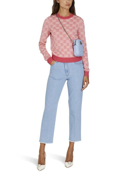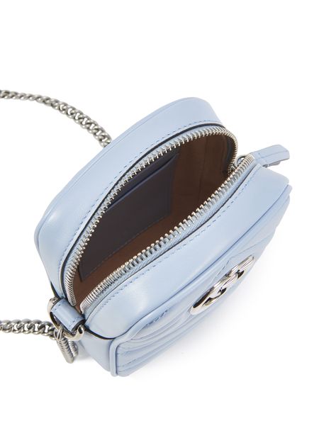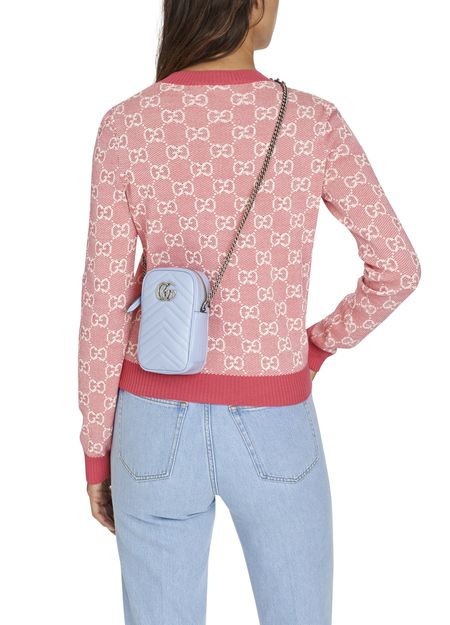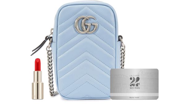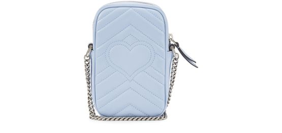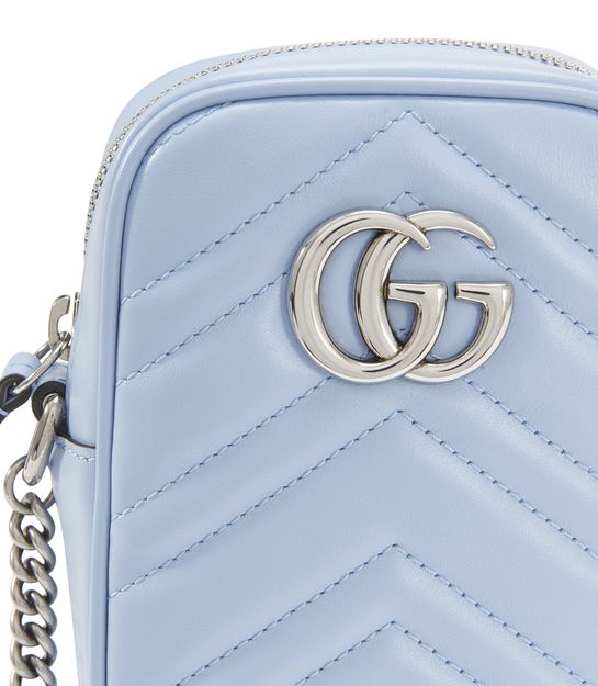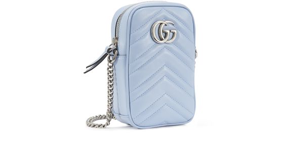 With the GG Marmont mini bag, Gucci presents a quilted chevron leather piece. This bag features a zippered closure and a chain shoulder strap.