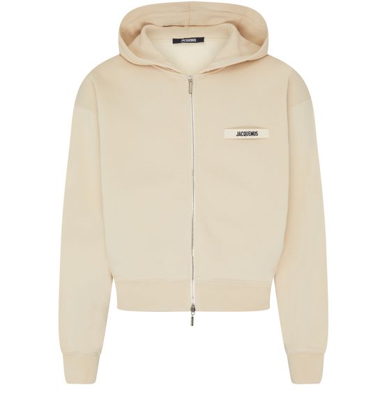 Jacquemus's Gros grain zipped hoodie showcases a stylish long design with long sleeves and a convenient zipper closure. The front logo adds a touch of brand identity, while the logo at the back label enhances its appeal. Visible stitching details and a cozy hood complete this modern wardrobe staple.