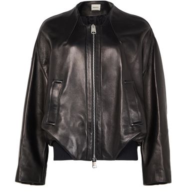 Reveal Khaite's Hewit leather jacket, a modern piece with a zipper closure and side pockets. Its short, collarless design and long sleeves make it an essential for casual jackets, offering both style and functionality.