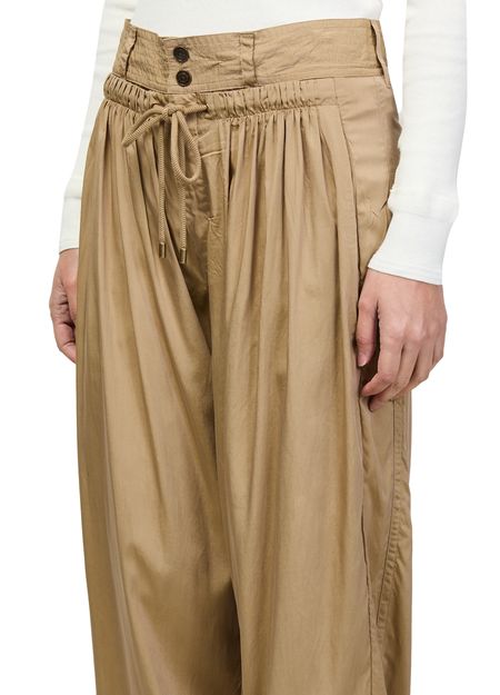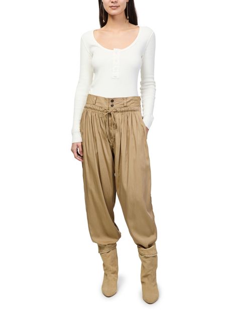 Reveal Isabel Marant's Inaya pants, crafted in a pyjama-inspired silhouette with a calf-length cut. The elasticated drawstring waist and front pleating offer effortless comfort, while side pockets and button fastening add practical flair. Elasticated ankles and belt loops complete this versatile, modern trouser for any occasion.