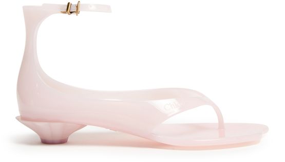 Discover Chloe's Jelly sandals, designed with a buckled ankle strap and visible stitching. The engraved logo and gold finish add a touch of elegance, while the ankle detail provides a unique flair. Featuring a logo-printed insole, open round toe, and low heel, these sandals combine style and comfort effortlessly.