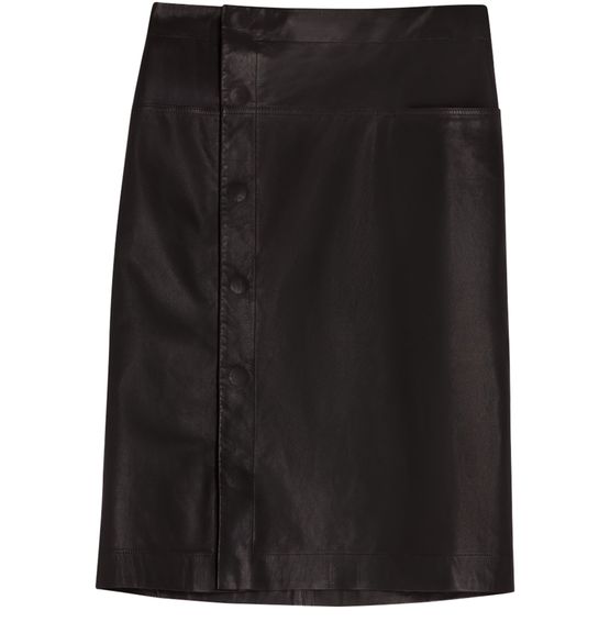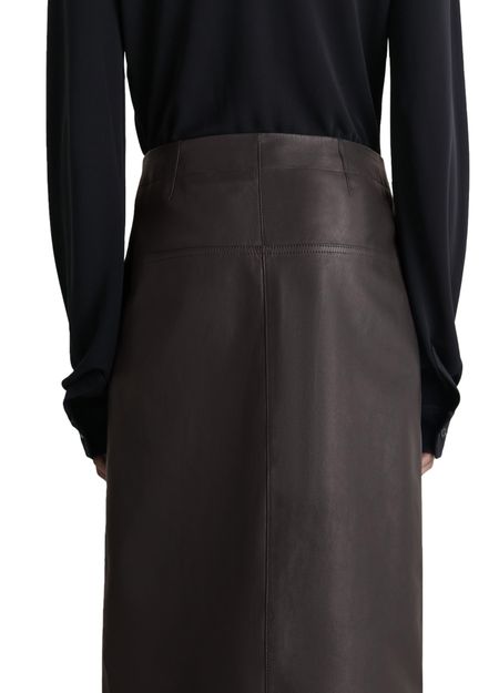 Discover Lemaire's leather wrapover skirt, a stunning embodiment of modern elegance. Crafted from smooth leather, it features a sophisticated midi length and a front buttoned closure. The large front pocket and visible stitching add a unique touch, making it a versatile piece that effortlessly transitions from day to night.