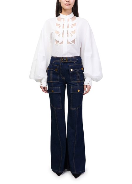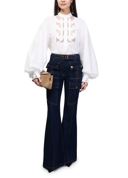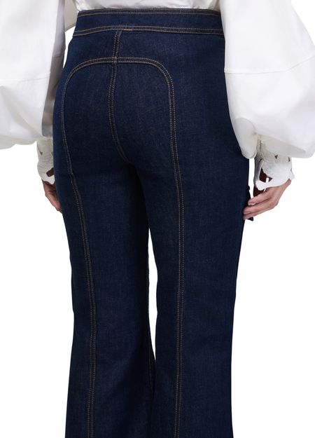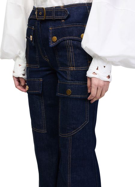 Reveal Zimmermann's Luna Utility flared jeans, crafted with ankle-length precision and defined by topstitched edges and patch details. The front and back paneling, along with flap and patch pockets, offer both style and function. Visible contrast stitching completes this modern silhouette for versatile, elevated dressing.