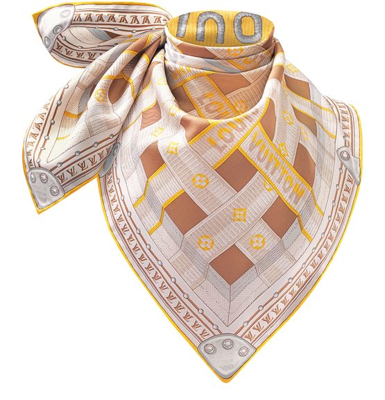 The LV Details square 90 draws inspiration from the shoulder strap of the iconic Alma bag as well as the Straps trunk. The central Louis Vuitton signature serves as a focal point while overlapping straps provide a geometric background effect. Small Monogram Flowers adorn alternating straps, while the intricate border design is patterned with the LV Initials.
