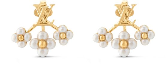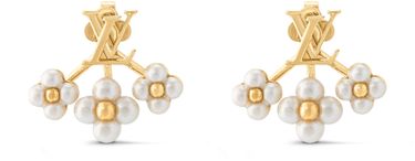 This pair of LV Floragram earrings from the LV Floragram line uses House signatures to enhance a whimsical design. The style showcases LV Initials on the lobe while a trio of pearl-effect resin beads in the shape of a Monogram Flower with a metal center emerges from under the ear. The mix of materials gives these pieces a three-dimensional effect.