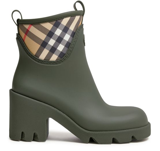 Reveal Burberry's Marsh ankle boots, featuring a round toe and a pull-on design for effortless wear. Crafted from durable rubber, these boots boast a high block heel and notched sole for added grip. The iconic Burberry Check and front logo add a touch of sophistication to this stylish pair.