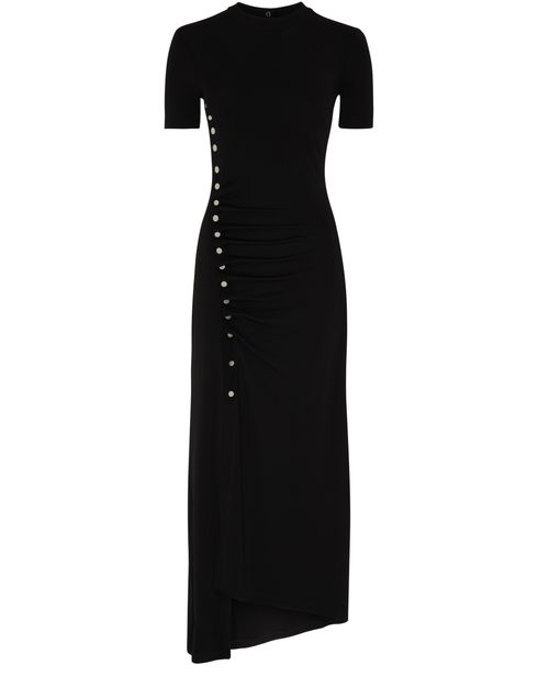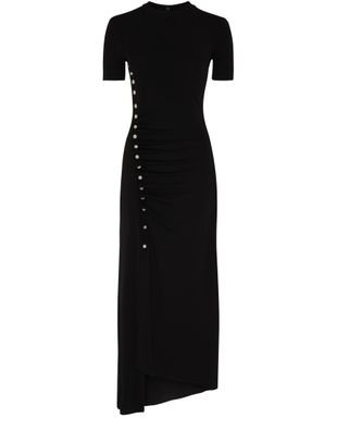 Paco Rabanne's maxi dress showcases a chic midi silhouette with short sleeves and a classic crew neck. Visible stitching adds a touch of detail, while the appliquéd logo enhances its modern appeal. A back buttoned fastening ensures a perfect fit, complemented by the logo at the back label for a signature touch.