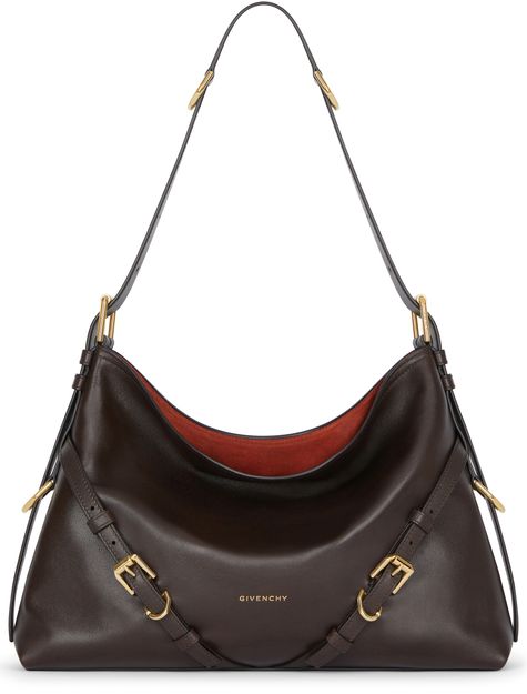 Unveil Givenchy's Medium Voyou bag in shiny leather, a sleek hobo design that encapsulates elegance. Crafted from smooth leather with a single handle, it features a flap closure, zippered interior pocket, and visible topstitching. Adorned with a front logo in gold letters, it exudes sophistication.