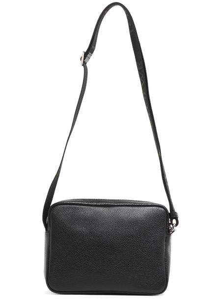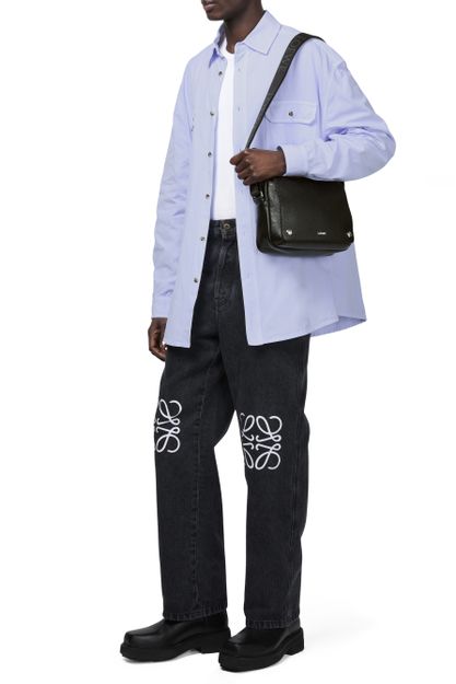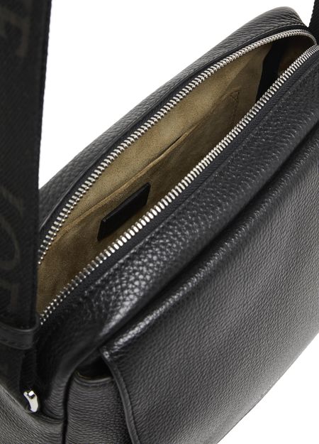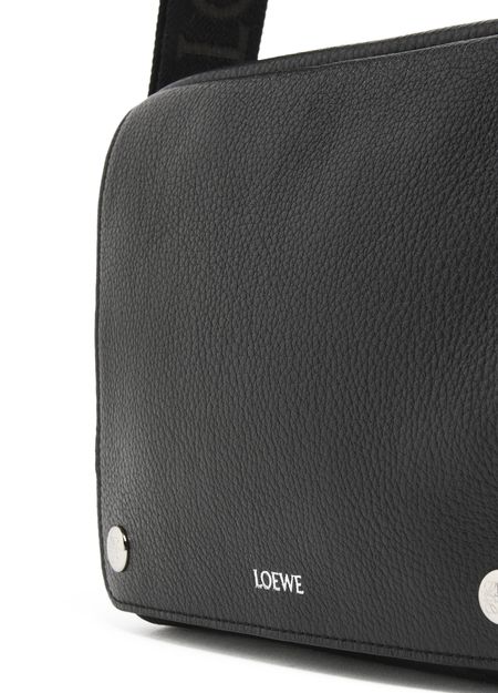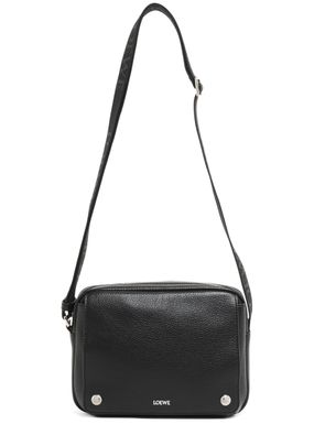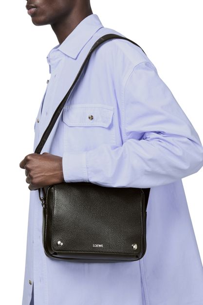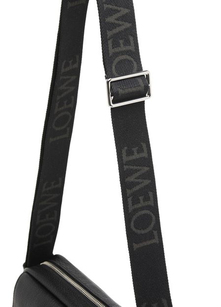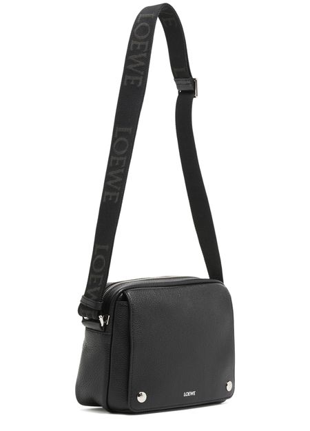 Loewe's Military Messenger XS in supple grained calf leather showcases a sleek design with a zipper closure and a front logo in silver letters. Its single handle and adjustable wide strap allow for versatile wear, while interior patch pockets and visible topstitching add functionality and style, perfect for crossbody use.