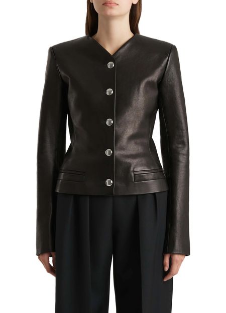 Reveal Khaite's Nara leather jacket, a collarless biker jacket with a short, modern silhouette. Crafted from supple leather, it features long sleeves, button fastening, and sleek welt pockets. This versatile piece transitions effortlessly from day to night, adding a refined edge to any ensemble.