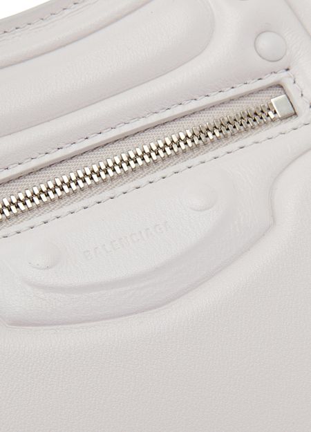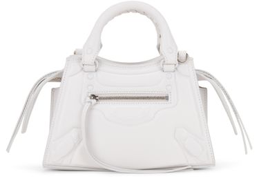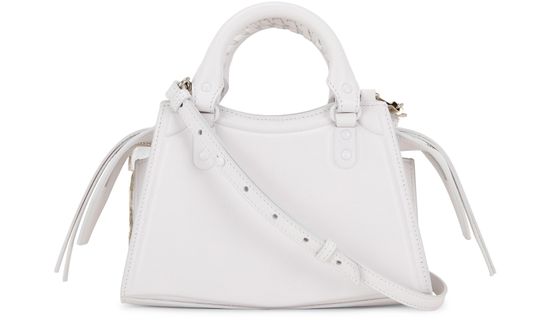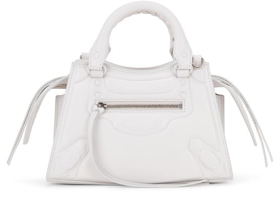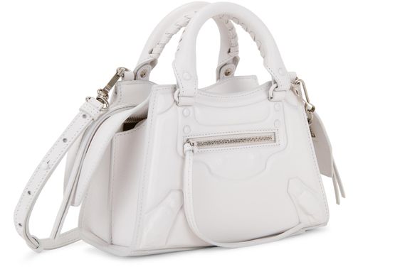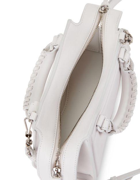 Description : Smooth leather bag, thin adjustable and detachable strap, visible stitching, two leather handles, zippered front pocket, zipper closure, hand carried, worn on the shoulder or crossbody.