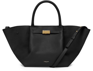 Reveal Demellier's The Midi New York handbag, crafted from grained leather with double handles and a thin, adjustable strap for versatile wear. The front logo, visible stitching, and silver finish add refined detail, while spacious compartments and secure snap-button fastening ensure both style and practicality.