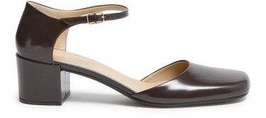 Reveal The Row's Penelope ankle strap pumps in leather, crafted from patent leather with a refined square toe and a secure buckled ankle strap. The medium block heel and visible stitching offer a modern silhouette, while the printed logo and leather insole add a signature touch of sophistication.