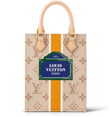 Made from beige Monogram canvas with a textile-like printed effect, the Petit Sac Plat is decorated with a vertical white-and-ocher stripe. In the center of the bag is what looks like a typical Parisian street-sign, featuring the words “Louis Vuitton Paris.” In addition to the two rolled-leather top handles, there’s a removable and adjustable strap.