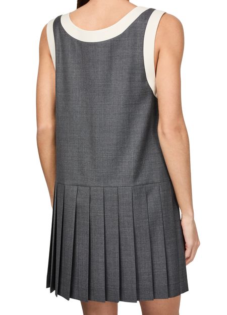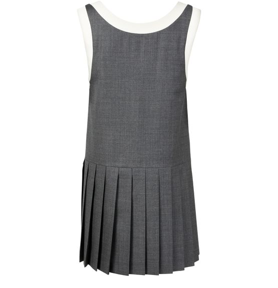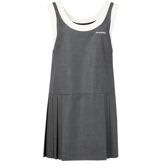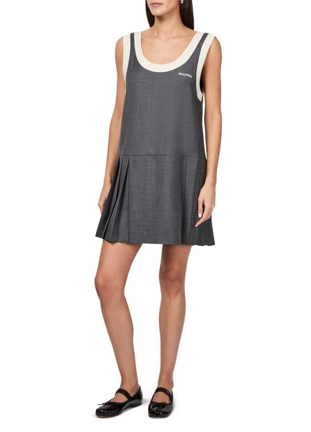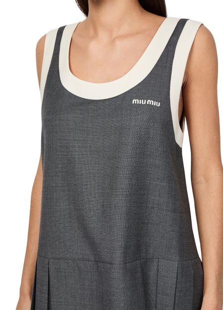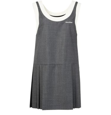 Miu Miu's Pleated dress showcases a sleeveless, mini design with an A-line cut that flatters every figure. Its round neck adds a classic touch, while the appliquéd logo and embroidered chest logo elevate the style. Visible stitching enhances the playful elegance, making it a must-have for any fashionista.
