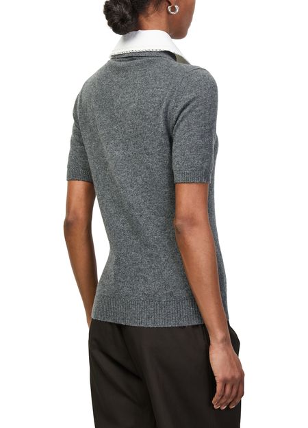Reveal Miu Miu's polo shirt with peter pan collar, featuring a delicately embroidered chest logo and short sleeves. The button fastening adds a refined touch, while the soft texture ensures comfort. Perfect for elevating both casual and sophisticated looks with a signature modern twist.