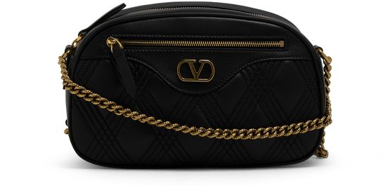 Valentino's Quiltie 67 camera case is a chic mini bag designed for modern adventurers. With a zipper closure and a single compartment, it offers practicality and style. The zippered front pocket and single handle enhance convenience, while the chain strap allows for a worn crossbody look. The metallic logo and visible topstitching add a touch of elegance.