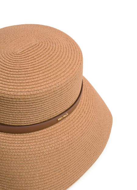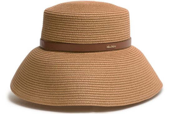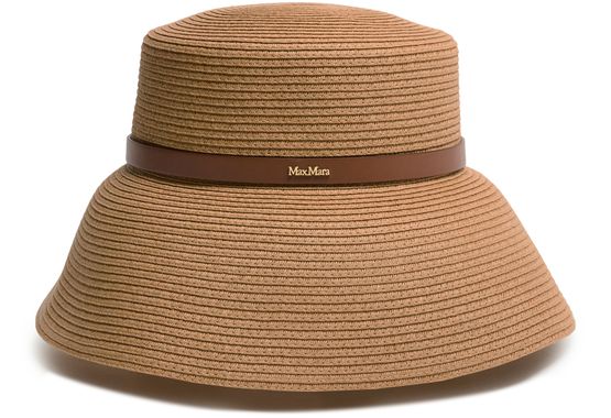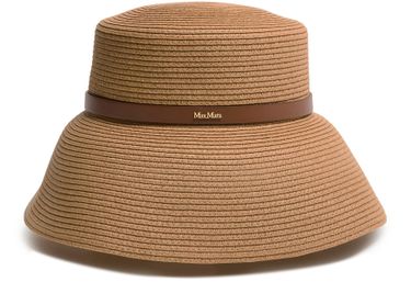 Reveal Max Mara's raffia hat, a straw hat with a round crown and wide brim. Visible stitching and a grosgrain ribbon add refined detail, while the gold-lettered logo at the front elevates its modern appeal. This versatile piece effortlessly complements both relaxed and sophisticated ensembles.