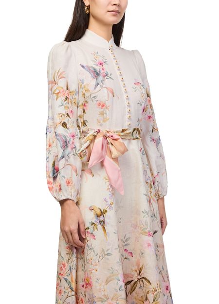 Reveal Zimmermann's Rebellion buttoned midi dress, featuring a captivating floral print and elegant midi length. The high-neck and long sleeves, paired with a mandarin collar and button fastening, create a refined silhouette. Embroidered details add a sophisticated touch, making it perfect for both daytime events and evening gatherings.