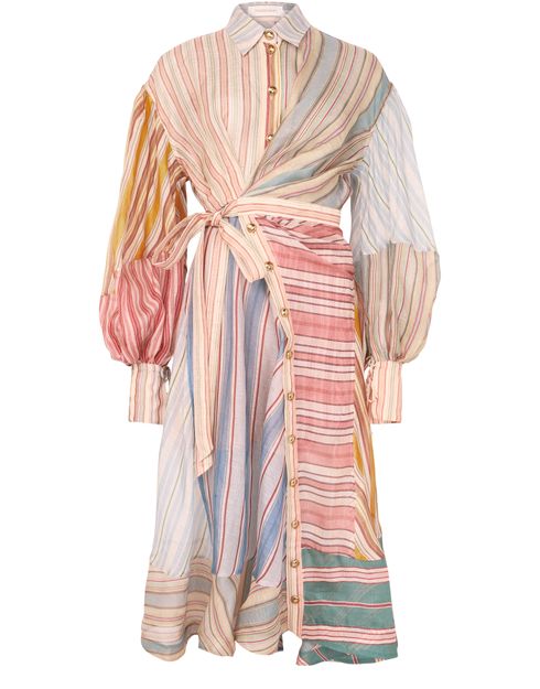 Reveal Zimmermann's Rebellion striped midi dress, a statement piece defined by its multicolor striped print and asymmetric cut. The buttoned-down collar and long, cuffed sleeves add refined structure, while the wrap silhouette and button fastening ensure a flattering fit for any occasion.