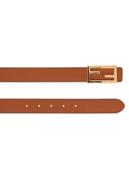 This reversible belt for women created by the designer, Fendi, has one side in brown leather and the reverse in a gingham pattern. It is adorned with a rectangular golden metal buckle.