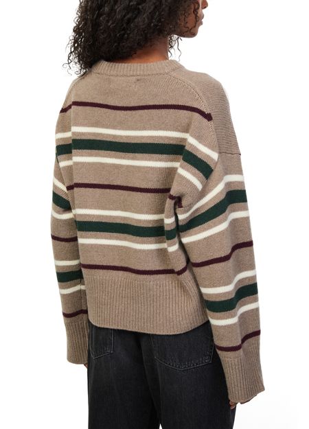 Reveal Skall Studio's crop round neck sweater, crafted in ribbed fabric with a striped print. The dropped sleeves and long-sleeved silhouette offer a relaxed yet refined look, making it a versatile choice for layering or pairing with high-waisted pieces for a modern statement.